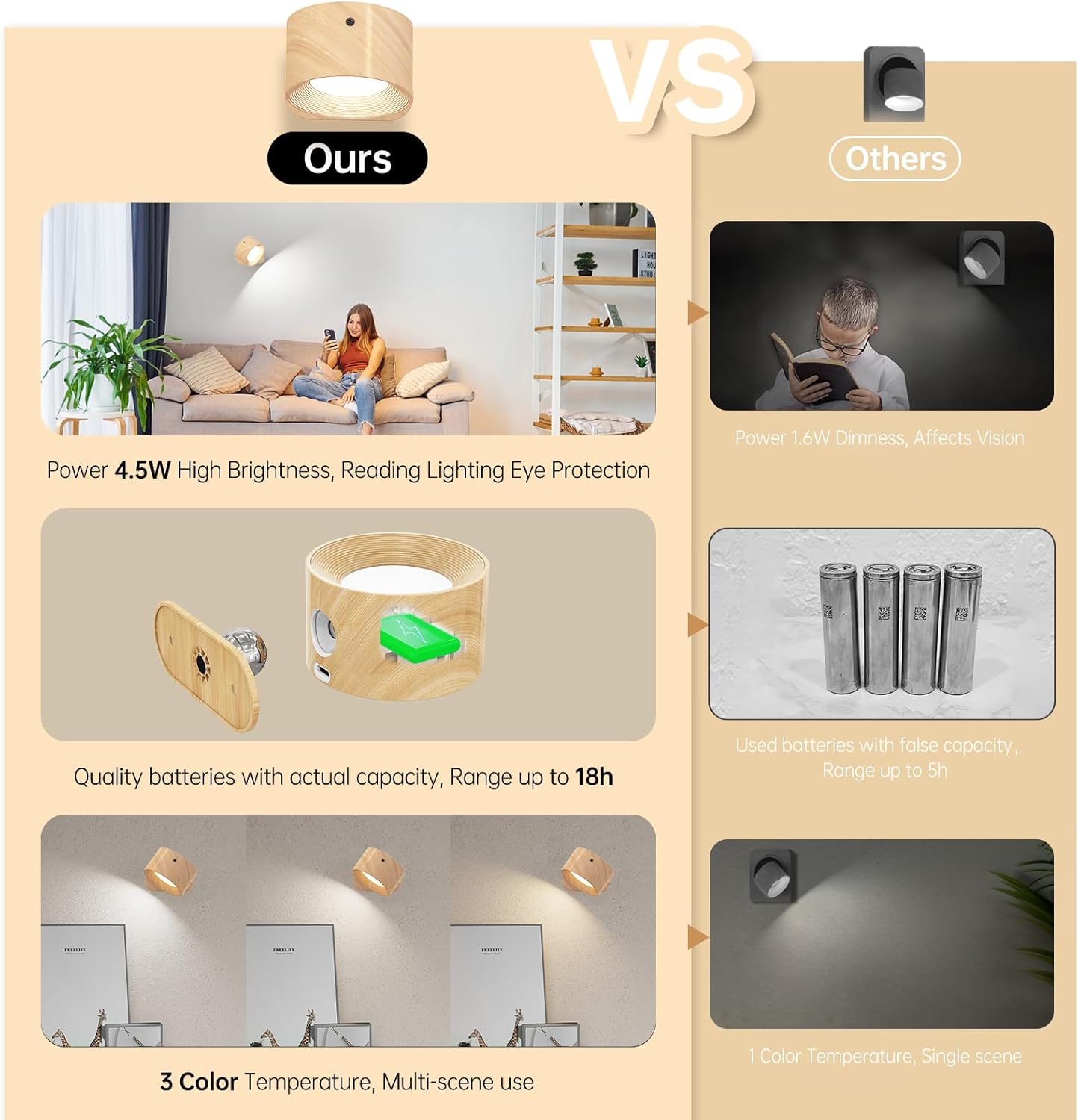 Koopala 3PACK Rechargeable LED Wall Sconce, Cordless Battery with Remote Powered Wall Sconce, 3 Brightness Levels, 360° Swivel Magnetic Shade for Reading Bedside, Wood Grain Color.